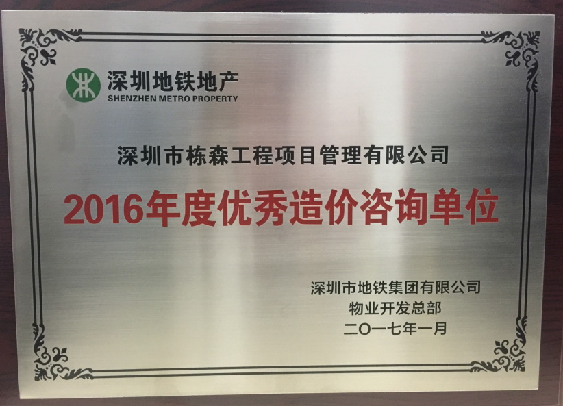 深圳市地鐵集團有限公司物業(yè)開發(fā)總部2016年度優(yōu)秀造價咨詢單位